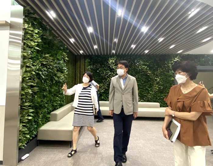 오승록 서울 노원구청장은 22일 구청 보건소 그린리모델링이 완료됨에 따라 현장을 방문해 시설 등을 점검하고 관련 부서 근무자들을 격려했다. 보건소는 녹색쉼터·북카페를 조성하고 편의시설을 확대했다. 사진은 오 구청장(가운데)이 현장을 방문해 시설을 둘러보고 있는 모습.(사진제공=노원구청)