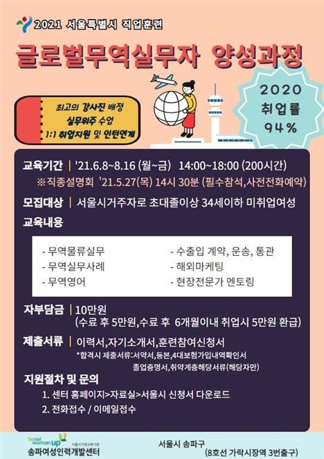 [시민일보 = 이승준]송파여성인력개발센터(센터장 유근수)가 ‘2021 서울특별시 여성 미래 일자리 발굴 및 확산 지원사업’의 일환으로 「글로벌 무역실무자 양성과정」 직업훈련을 실시한다. 청년여성을 대상으로 맞춤형 사회 진출을 지원하여 특화 일자리 창출에 기여하고자 하는 것이다.