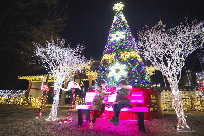 충남 홍성군이 성탄절과 연말연시를 맞아 최근 군청 홍주아문에 대형 크리스마스트리를 설치했다. 트리는 오는 2021년 1월31일까지 운영되며, 트리 앞에는 야간조명, 벤치 등의 포토존이 마련됐다. 사진은 어린이들이 포토존에서 기념 촬영을 하는 모습. (사진제공=홍성군청)