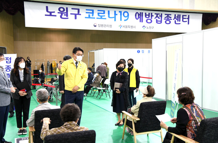오승록 서울 노원구청장은 6일 제2호 코로나19 예방접종센터(월계문화체육센터)를 방문해 첫날 운영현황을 점검했다. 2호 접종센터는 지역내 월계1~3동·공릉1~2동· 하계2동 거주 75세 노인을 대상으로, 오전 9시~오후 4시 예약제로 운영된다. 사진은 이날 오 구청장이 현장에서 주민들과 이야기를 하고 있는 모습. (사진제공=노원구청)