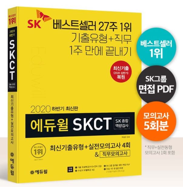 [시민일보 = 여영준 기자] 종합교육기업 에듀윌(대표 박명규)이 발간한 2020년 하반기 최신판 SKCT 교재가 온라인서점 예스24 SK 부문에서 9월 2주차 베스트셀러 1위에 올랐다.