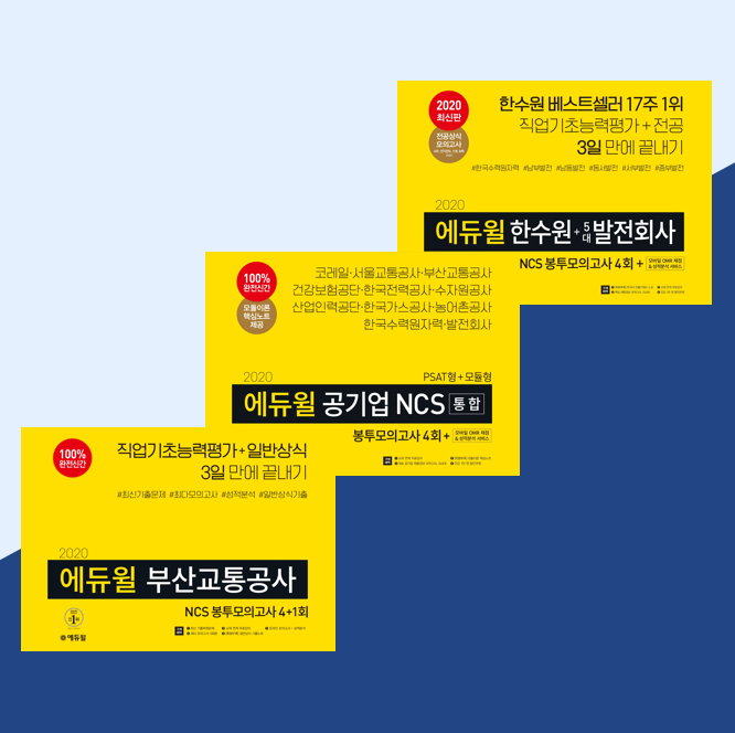 8일 에듀윌에 따르면 ‘2020 에듀윌 공기업 NCS 통합 봉투모의고사 4회 PSAT형+모듈형’은 취업/면접/상식 부문에서, ‘2020 에듀윌 부산교통공사 NCS 봉투모의고사 4+1회’은 부산교통공사 부문에서, ‘2020 에듀윌 한수원 + 5대 발전회사 NCS 봉투모의고사 4회’는 한국수력원자력 부문에서 각각 4월 베스트셀러 1위를 차지했다.