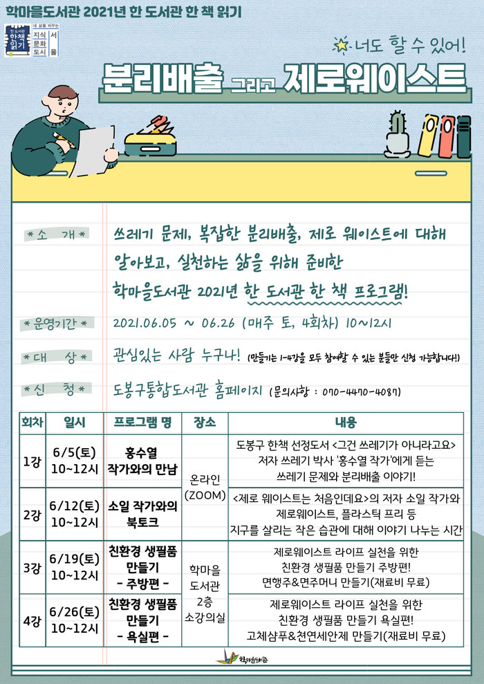 [시민일보 = 여영준 기자] 서울 도봉구(구청장 이동진) 학마을도서관은 오는 6월5일 환경의 날을 기념하고 지속가능한 삶을 위한 ‘너도 할 수 있어! 분리배출 그리고 제로 웨이스트(Zero Waste)’ 프로그램을 운영한다.