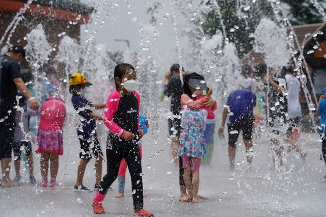 전남 해남군 고천암생태공원에 나들이 나온 어린이들이 바닥분수에서 무더위를 식히고 있다.