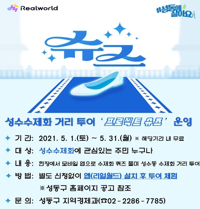 ‘프로젝트 슈즈’는 성수역~뚝섬역 일대 성수수제화 희망플랫폼, 성수역 구두테마공간 등 수제화 거리를 걸어다니며 모바일 기기화면에 나타나는 이야기에 따라 퀴즈미션을 수행하는 프로그램이다.