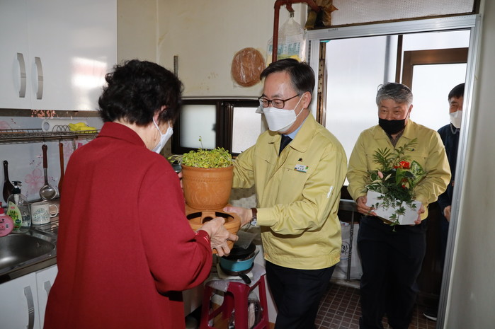 유성훈 서울 금천구청장이 최근 코로나19로 외출을 하지 못하는 홀몸노인들을 위해 콩나물시루와 공기정화식물 등 반려텃밭 분양에 나섰다. 사진은 유 구청장(가운데)이 시흥동과 독산동 홀몸노인 6가구를 직접 방문해 반려텃밭 2세트씩을 전달하고 있는 모습. (사진제공=금천구청)
