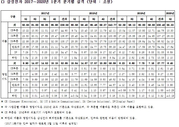 [시민일보 = 여영준 기자] 삼성전자는 연결 기준으로 매출 55.33조원, 영업이익 6.45조원의 2020년 1분기 실적을 발표했다.