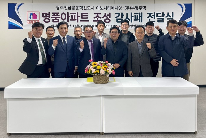 [시민일보 = 홍덕표 기자] 전라남도 나주시 빛가람동에 위치한 광주전남혁신 이노시티 애시앙 아파트 입주자대표회의가 지난 1일 아파트 단지내 관리사무소에서 아파트 시공사인 부영주택에 감사패를 전달했다.