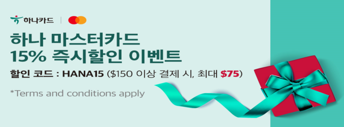 우선, 아마존에서 이달 말일까지 ▲50달러 이상 합산 구매 시 5달러 캐쉬백 ▲100달러 이상 합산 구매 시 10달러 캐쉬백 혜택을 제공하며, 20일부터 12월31일까지 블랙프라이데이 프로모션으로 하나 마스터카드를 소지한 손님은 프로모션코드(HANA15)를 통해 ▲150달러 이상 구매 시 15% 즉시할인(1인 최대 75달러 한도)을 제공해 최대 85달러 혜택을 받아볼 수 있다.