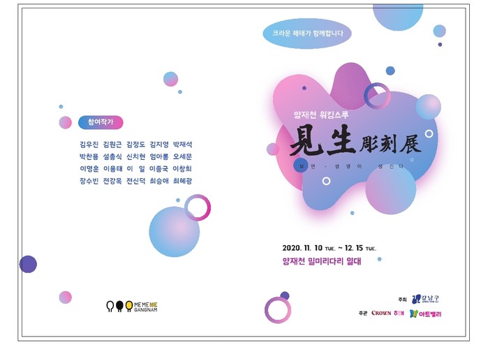 특히 ▲DOG(김우진) ▲엔젤맨(김원근) ▲걸어가다(이창희) ▲사랑의 정령(박재석) 등 국내 유명 조각가들의 작품 총 20점이 전시됐으며, 안내판에 있는 QR코드를 활용해 감상평을 남길 수 있다. 작품이 전시된 양재천 밀미리교는 지하철 3호선 매봉역 4번 출구로 나오면 방문할 수 있다.