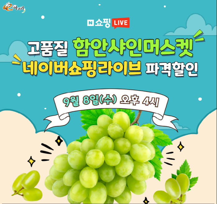 함안군이 제철을 맞아 판매중인 샤인머스켓 포도를 더욱 많은 소비자들이 맛볼 수 있도록 오는 8일 오후 4시 네이버쇼핑 ‘라이브 커머스’를 통해 시중가보다 30% 이상 할인하여 2kg 상자당 3만 원에 판매를 실시한다.
