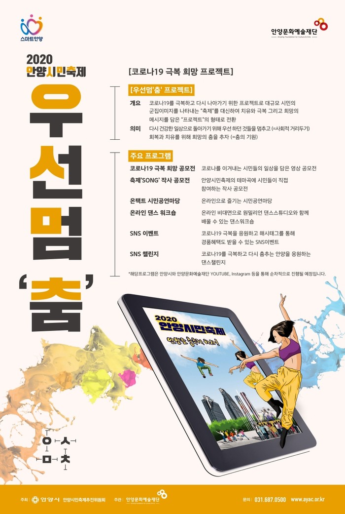 [안양=최휘경 기자]경기도 안양시는 2020 안양시민축제 키워드를 우선멈 ‘춤’으로 정하고 10월과 11월 두 달간 펼친다고 밝혔다.