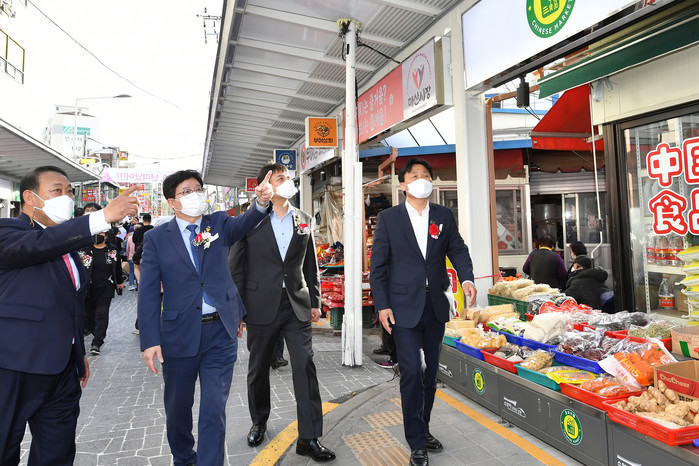 경기 수원시는 1일 매산시장에서 경관개선사업 준공식 및 상권활성화사업 추진상황 보고회를 열었다. 이 사업은 매산시장 130m 구간 39개 점포에서 진행됐으며, ‘반아케이드’ 설치 및 매대·간판 등을 개선했다. 사진은 이날 염태영 시장(왼쪽 두 번째)이 매산시장을 둘러보고 있는 모습. (사진제공=수원시청)