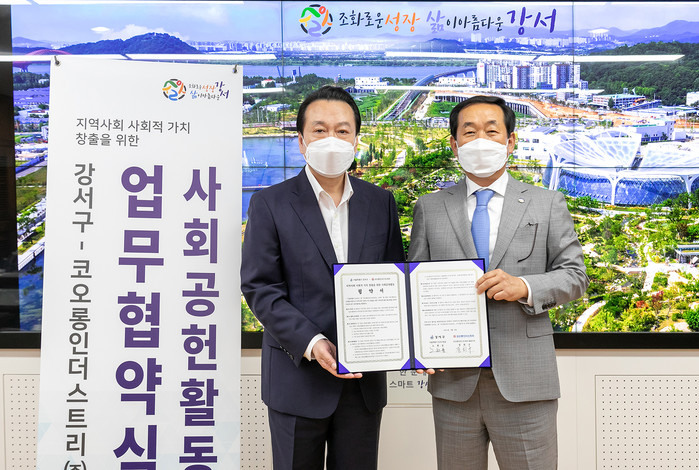 서울 강서구가 최근 코오롱인더스트리와 ‘지역사회 사회적 가치 창출을 위한 사회공헌활동 협약(MOU)’을 체결했다. 협약에 따른 협력 분야는 지역사회 사회복지 증진 및 개발·발전에 관한 사회공헌활동 등이다. 사진은 협약식에서 노현송 구청장(왼쪽)과 장희구 대표가 기념촬영을 하는 모습. (사진제공=강서구청)