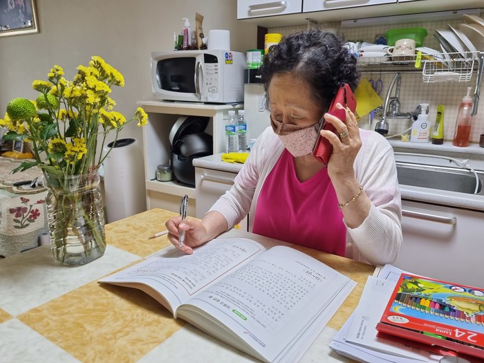| ▲ 데일리 홈런 프로그램에 참여하고 있는 한 노인이 기억친구 자원봉사자와 전화를 하며 학습을 하고 있다. (사진제공=노원구청) |