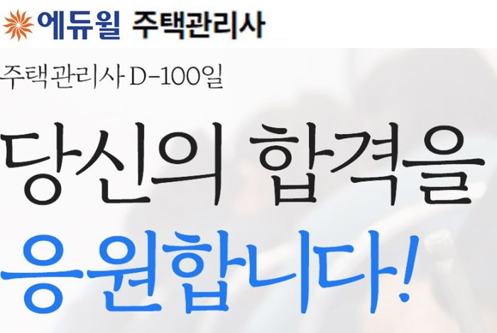 [시민일보 = 황혜빈 기자] 2020년 제23회 주택관리사 자격증 시험을 100일 앞둔 현재, 종합교육기업 에듀윌(대표 박명규)이 수험생의 고득점을 기원하고자 응원 이벤트를 실시한다.