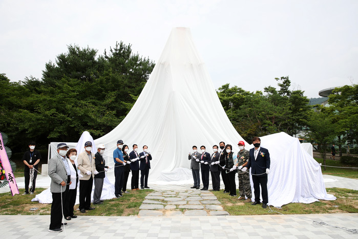경기 이천시가 지난 6일 설봉공원에서 '이천시 월남전참전기념탑 제막식'을 개최했다. 기념탑 주탑은 가로 16m·폭 1m·높이 8.8m로 월남전 참전기간인 8년 8개월의 의미를 담았으며, 스토리월에는 월남전 참전용사 521명의 이름이 새겨졌다. 사진은 이날 엄태준 시장(가운데 오른쪽)과 관계자들이 제막식을 진행하고 있는 모습. (사진제공=이천시청)