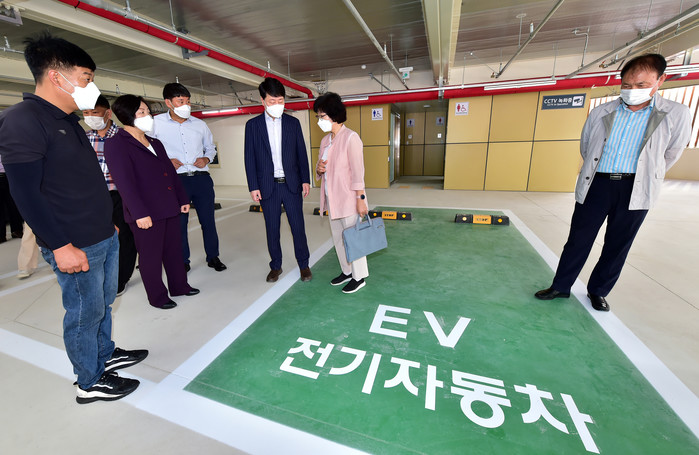 | ▲ 14일 삼산 해돋이 공영주차장을 방문한 차준택 구청장(오른쪽 세 번째)이 관계자들과 현장을 둘러보는 모습. (사진제공=인천 부평구청) |