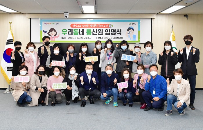 서울 중랑구가 최근 ‘우리동네통신원’ 임명식 및 활동보고회를 개최해 신규 통신원 임명장 수여 및 그간의 활동성과를 돌아보고 활동계획과 방향에 대해 논의했다. 사진은 이날 류경기 구청장(앞줄 왼쪽에서 다섯 번째)과 관계자들이 기념촬영을 하는 모습. (사진제공=중랑구청)