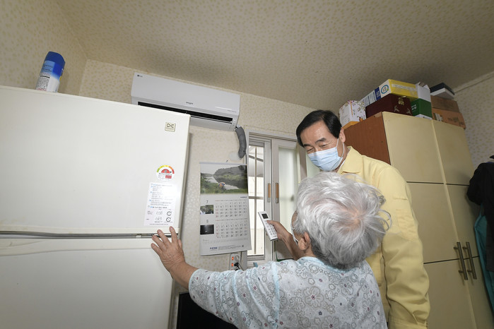 문석진 서울 서대문구청장이 지난 11일 북가좌2동의 한 홀몸노인 가구를 방문해 장마 후 폭염에 대비해 최근 구가 설치한 에어컨 작동 상태를 확인했다. 사진은 문 구청장이 안부를 확인하고 에어컨 작동 상태를 살펴보고 있는 모습. (사진제공=서대문구청)