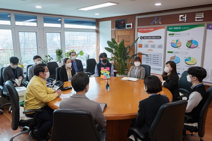 충남 아산시 멘토-멘티제도 활동 중 하나인 멘토링 그룹 ‘당·당·한·나’가 1일 시장실을 방문해 오세현 시장에게 궁금한 점을 질문하고 공무원 생활에 대한 조언을 듣었다. 사진은 오 시장(왼쪽)이 멘토링그룹 ‘당당한나’와 대화를 나누고 있는 모습. (사진제공=아산시청)