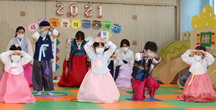 설날을 사흘 앞둔 9일 광주 북구청 직장어린이집 아이들이 한복을 입고 세배하는 법을 배우고 있다.