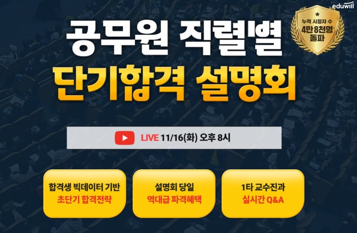 [시민일보 = 여영준 기자] 에듀윌 공무원이 ‘공무원 직렬별 단기합격 설명회’를 오는 16일 오후 8시에 진행한다고 밝혔다.
