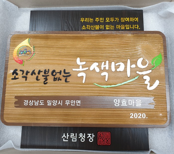 산림청이 주관하는 2020년 ‘소각산불 없는 녹색마을’로 밀양시 무안면 양효마을이 선정돼 우수마을 인증 현판과 15만원 부상을 받았다.