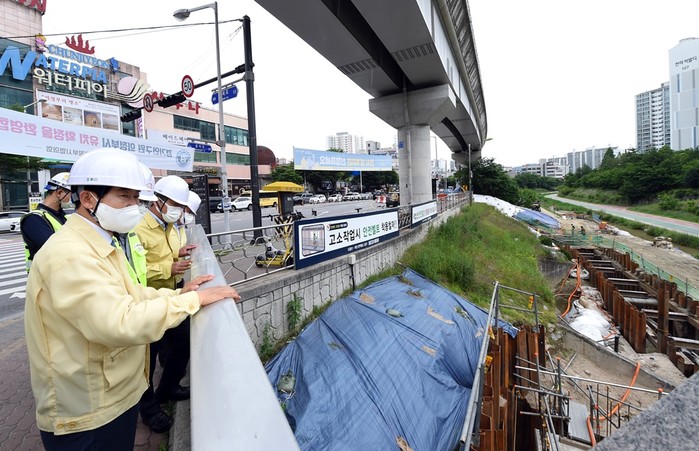 안병용 경기 의정부시장이 8일 여름철 우기를 대비해 안전사고가 발생하지 않도록 지역내 도봉산~옥정 광역철도 건설공사 현장을 방문해 안전관리 실태를 점검했다. 사진은 안 시장(왼쪽)이 관계자들과 현장을 살펴보는 모습. (사진제공=의정부시청)