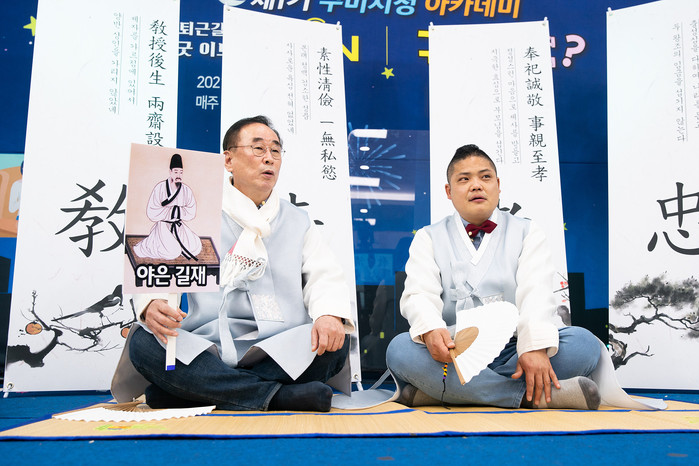 경북 구미시가 18일 제1기 구미시정아카데미 수강생 40명을 대상으로 구미시 문화관광 분야와 농특산물 수업을 진행했다. 사진은 이날 행사에 참여한 장세용 시장(왼쪽)이 구미지역의 역사수업(성리학자)을 진행하고 있는 모습. (사진제공=구미시청)