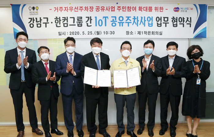 정순균 강남구청장(왼쪽 다섯번째)이 25일 서울 강남구청 회의실에서 한컴모빌리티와 IoT 공유주차사업 업무협약(MOU)을 체결하고 기념촬영을 하고 있다. 강남구는 효율적인 주차면 이용과 부정주차 해결을 위해 한컴모빌리티와 주차 센서 설치 및 주차 데이터 수집 등에 관한 업무 협약을 맺고 서비스 개발을 진행할 예정이다.