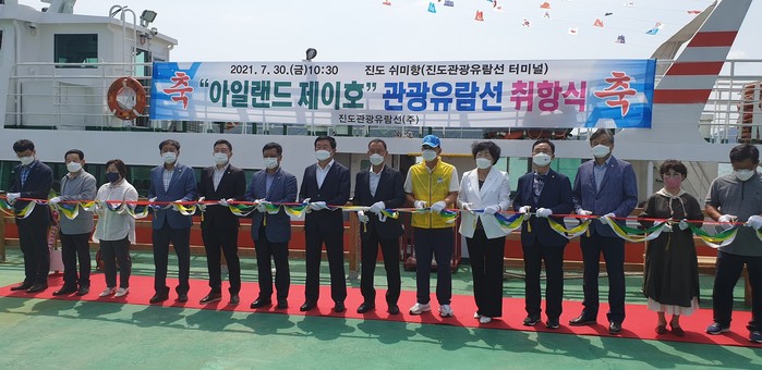 30일 진도군 유람선 선착장인 쉬미항 터미널에서 이동진 군수, 도의원, 군의장 및 의원, 주민 등이 방역수칙을 준수하면서 간소하게 유람선인 아일랜드 제이호 취항식을 치렀다.