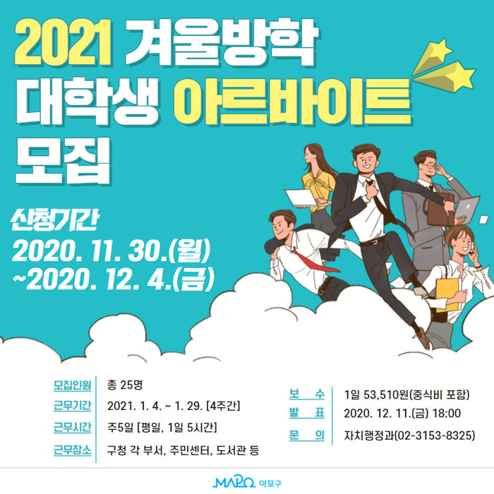 [시민일보 = 홍덕표 기자] 서울 마포구(구청장 유동균)가 오는 30일부터 12월4일까지 지역내 대학생을 대상으로 '2021년 겨울방학 대학생 아르바이트'에 참여할 학생을 모집한다.