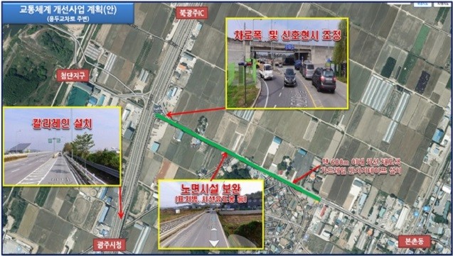 이에, 광주시는 원활한 교통소통과 교통안전을 위해 빛고을대로에서 본촌방면 우회 전차로 노면 유도 색깔(칼라레인)을 설치하고, 용두교차로에서 본촌방면 노후 차선 재정비 및 차로 폭 재조정, 도로와 주변 경작지 단차구간 노면 시설(표지병, 시선유도봉 등) 설치 등 1㎞ 구간에 대해 교차로 교통체계를 개선할 계획이다.