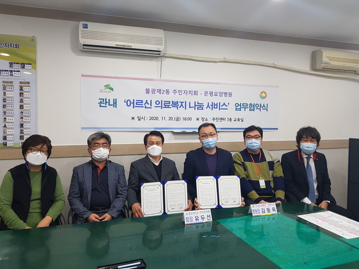 서울 은평구 불광제2동주민자치회가 최근 은평요양병원과 지역내 '어르신 의료복지 나눔 서비스' 제공을 위한 업무협약을 체결했다. 이날 협약을 통해 공동간병비용 등에 10~20% 할인 혜택을 제공하며, 기타 의료지원 서비스 상호협력 및 실무자 간 네트워크를 구축할 계획이다. 사진은 이날 협약식에서 관계자들이 기념촬영을 하고 있는 모습. (사진제공=은평구청)