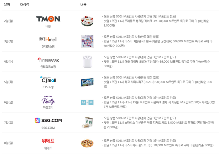 이벤트는 12월2일 티몬을 시작으로, 3일(화)은 현대Hmall, 4일(수)은 인터파크쇼핑에서 결제 금액의 절반을 M포인트로 사용할 수 있고, 5일(목)에는 CJmall, 6일(금)에는 마켓컬리에서도 같은 혜택이 주어진다. 주말인 7일(토)과 8일(일)에는 각각 SSG.COM과 위메프에서 50% M포인트 사용 혜택을 누릴 수 있다.