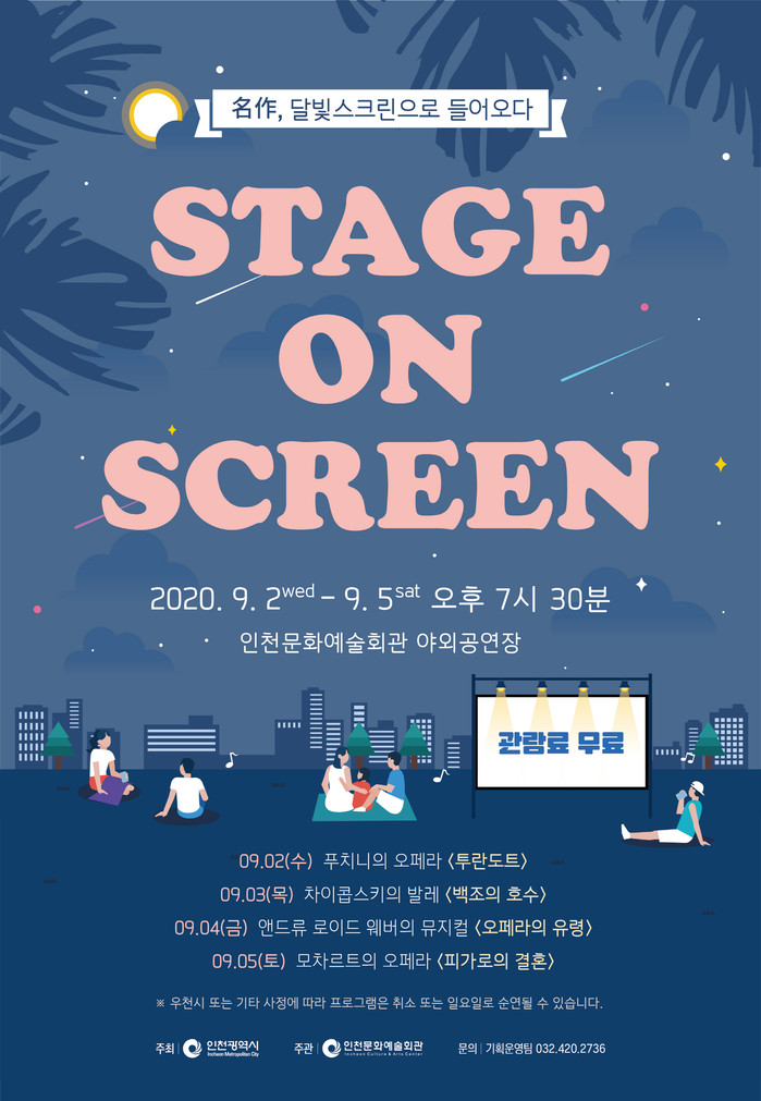 본래 인천문화예술회관의 너른 야외광장에서 진행된 <스테이지 온 스크린>은 올해 코로나19 예방을 위한 방역지침에 따라 야외공연장으로 장소를 옮기어 진행된다. '좌석 띄어앉기'를 시행해 약 200석 규모로 입장객 수를 제한하며 마스크 착용, 클린인천 출입인증 시스템(QR코드) 등을 활용하여 관객들의 안전하고 쾌적한 관람을 돕는다.