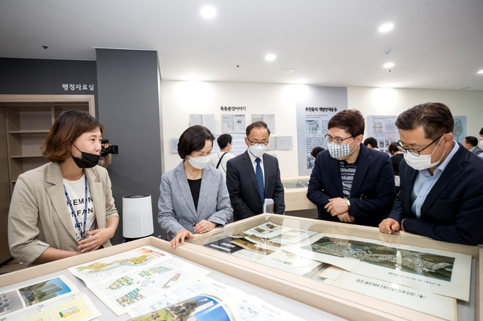 서울 양천구는 기록물 보존서고 확충 조성이 완료됨에 따라 ‘기록으로 보는 목동신시가지아파트 개발’을 주제로 오는 12월30일까지 개관 기념 전시회를 개최한다. 사진은 김수영 구청장(왼쪽 두 번째)이 기록물 보전서고에서 전시된 기록물을 감상하고 있는 모습. (사진제공=양천구청)