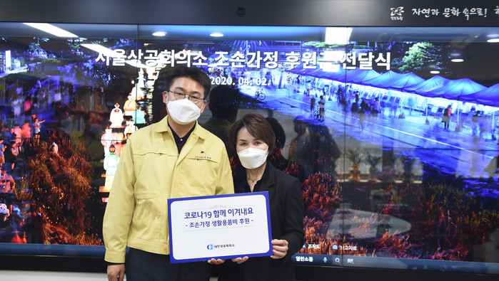 서울 노원구는 2일 구청장실에서 ‘서울상공회의소와 코로나19 위기 극복 조손가정 후원금 전달식’을 개최하고 서울상공회의소로부터 후원금 1500만원을 전달받았다. 사진은 오승록 구청장(왼쪽)과 관계자가 기념촬영을 하는 모습.(사진제공=노원구청)