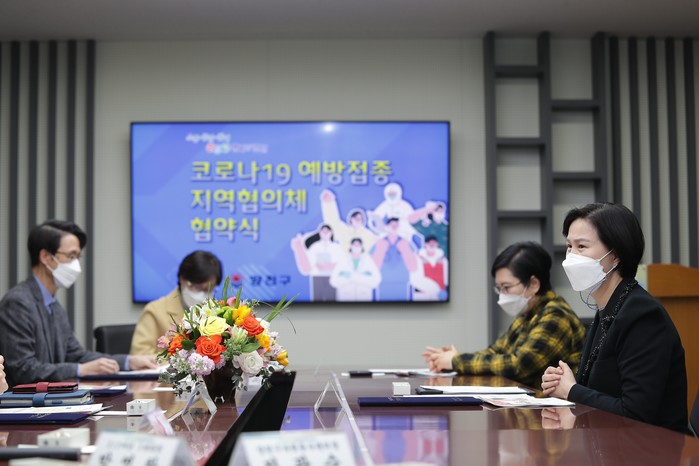 서울 양천구는 18일 안전하고 체계적인 코로나 백신 예방접종을 위해 양천경찰서·양천소방서·213여단 3대대·이대목동병원·의사협회·간호사협회·자원봉사센터와 '코로나19 예방접종 지역협의체'를 구성했다. 사진은 이날 협약식에서 김수영 구청장(오른쪽)이 관계자들과 대화를 나누고 있는 모습. (사진제공=양천구청)