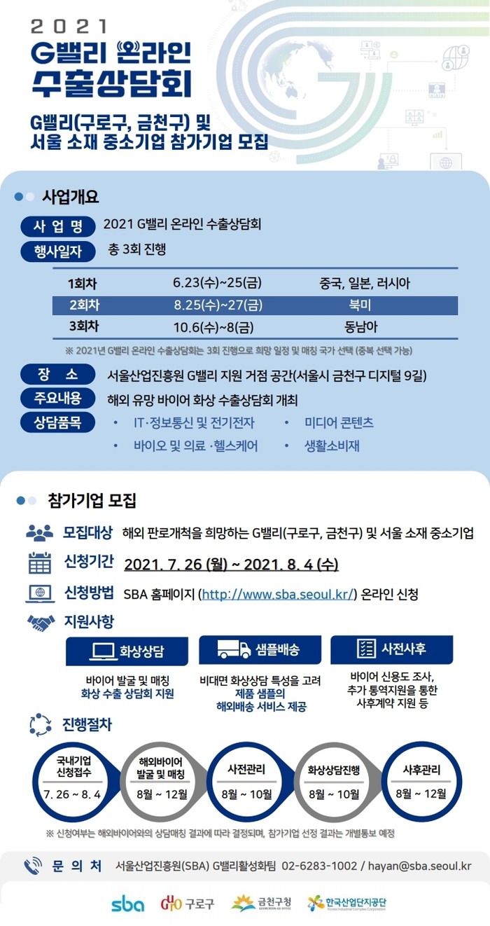 서울산업진흥원, 금천구, 한국산업단지공단 등과 함께 진행하는 ‘G밸리 온라인 수출상담회’는 기업과 해외 바이어가 온라인 플랫폼을 활용해 교류하는 행사다.