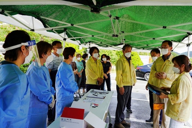 명현관 해남군수는 7일 해남군 선별진료소 등을 현장점검하고, 폭염속 방역의 최일선에서 구슬땀을 흘리고 있는 의료진과 직원들을 격려했다.