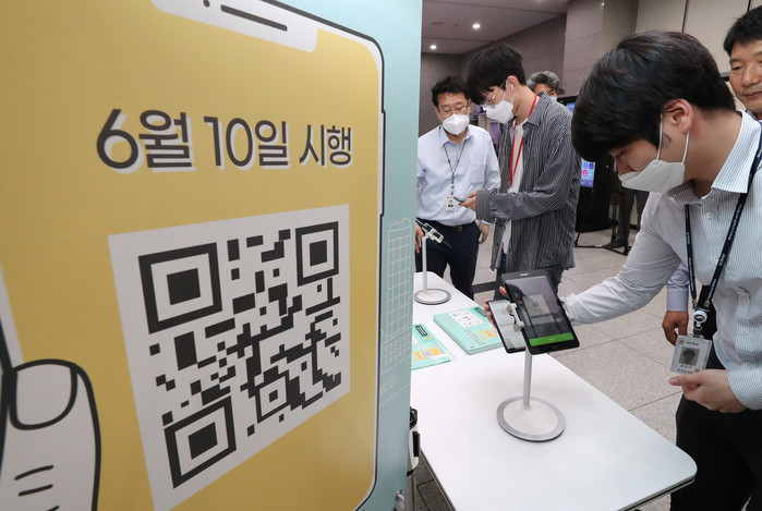 정부가 코로나19 확산 방지를 위해 오는 10일부터 감염병 고위험시설에 대해 QR코드 기반의 전자출입명부(Ki-Pass)를 의무 도입하기로 한 가운데 2일 오후 세종시 정부세종청사 보건복지부에서 시범운영을 하고 있다.
