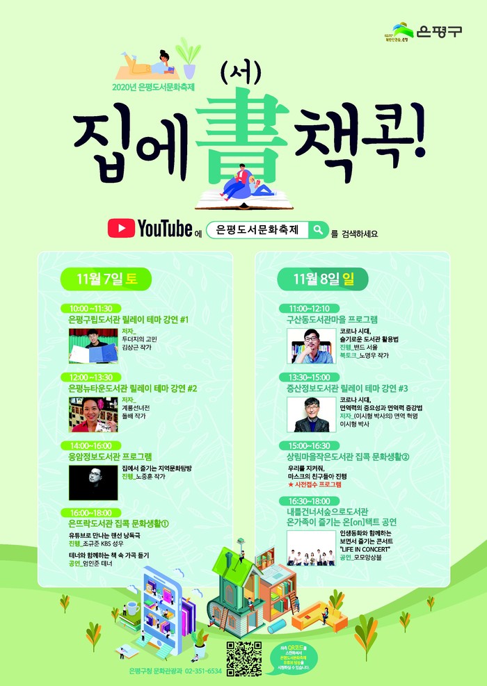 [시민일보 = 이대우 기자] 서울 은평구(구청장 김미경)는 은평구가 주최하고 은평구 공공도서관(은평구립도서관, 구립증산정보도서관, 구립응암정보도서관, 상림마을작은도서관, 구립은평뉴타운도서관, 구립구산동도서관마을, 내를건너숲으로도서관, 구립은뜨락도서관)이 공동 주관하는 '2020년 은평도서문화축제'를 7~ 8일 이틀간 온라인으로 개최한다고 밝혔다.