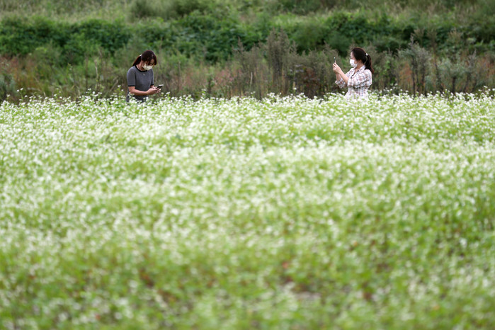 인천 옹진군 백령면 진촌6리 메밀밭에 메밀꽃이 만개했다. 사진은 메밀밭을 지나가던 마을 주민들이 만개한 메밀밭을 배경으로 사진촬영을 하고 있는 모습. (사진제공=옹진군청)