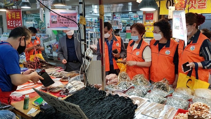 경기 구리시 인창동 주민자치위원회는 지난 14일 인창동 행정복지센터 직원들과 함께 '구리전통시장 장보기 캠페인'을 실시했다. 사진은 전통시장에서 장을 보고 있는 회원들의 모습. (사진제공=구리시청)