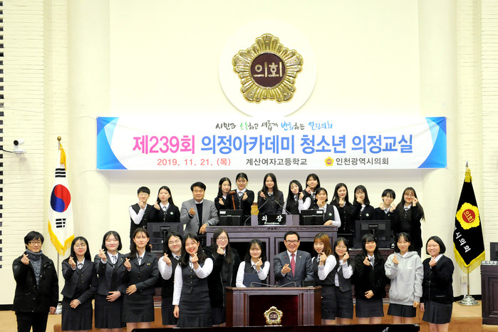 [인천=문찬식 기자] 인천시의회가 최근 계산여자고등학교(계양구 계산새로 소재) 학생회 임원 25명을 대상으로 제239회 의정아카데미 청소년 의정교실을 개최했다.