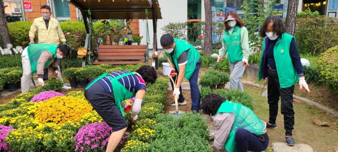 경기 의정부시 송산1동 주민센터가 지난 28일 새마을지도자협의회·새마을부녀회 등과 함께 주민센터 실외정원 ‘송산愛뜰’에 국화꽃을 심어 단장했다. 사진은 이날 봉사자들이 국화꽃을 식재하고 있는 모습. (사진제공=의정부시청)