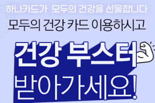 ‘건강부스터2’ 이벤트는 직전 6개월간 하나 신용카드 결제 이력이 있는 손님을 대상으로 하나카드 홈페이지내 건강 부스터 이벤트 페이지에서 응모완료 후 3개월 이내 모두의 건강카드를 10만원 이상 이용하면 ▲VIP 헬스케어서비스 (건강검진 예약 및 비용우대, 전문가와 건강상담, 병원 안내 및 진료예약대행, 월 1회 건강컨텐츠 제공)를 제공한다.