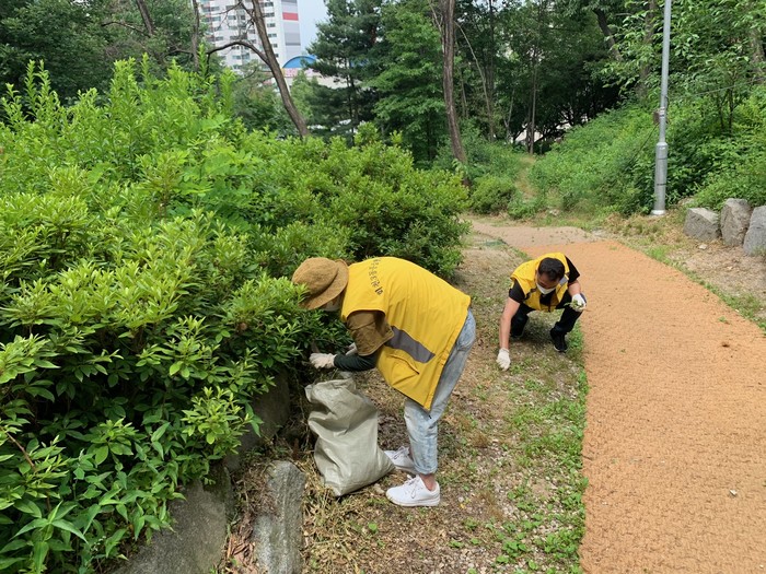 경기 양주시 회천3동 통장협의회가 7일 마을 환경정비 활동으로 행정복지센터 삼거리·봉우근린공원·엄상마을 고암소공원 등 3개구역에서 도로변 제초작업 및 정화활동을 펼쳤다. 사진은 통장협의회 회원들이 공원 산책로에서 제초작업을 하고 있는 모습. (사진제공=양주시청)